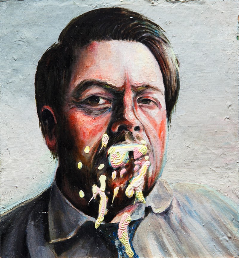 My work has evolved around a fascination about portraiture and figurative painting with a particular emphasis on politics and history. In my paintings I challenge many of the criteria’s of the painting tradition and flirt with the grotesque. They have a ground in a more classical representative painting, especially within the portrait and figurative tradition. After having finished the painting in this representative style I continue with the work in another, more abstract and expressionist style, one that has references to the gesture-led field of post-war expressionist painting. A turnaround that calls for a new interpretation and a different narrative. The blotch of colour comes in as a separate action contaminating the portrait, almost cancerous, altering it in the process. It alludes to Chromophobia or the fear of colour, prejudice against colour which masks a deep fear of a contamination by the unknown. I‘m looking at colour’s role as a subversive way to challenge established hierarchies, and as a way of undermining authority.